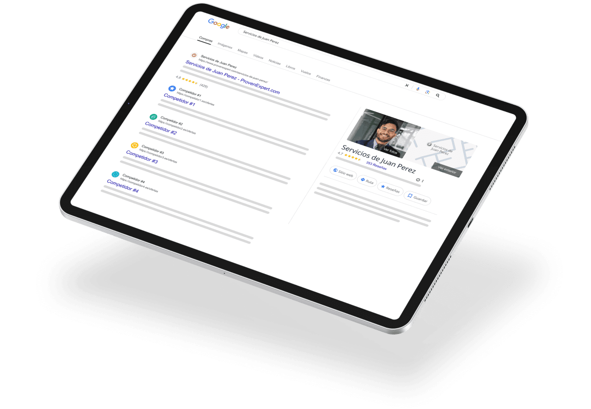 Tu perfil ProvenExpert se optimiza automáticamente para Google y otros buscadores, asegurando que los clientes potenciales te encuentren antes que a tu competencia. Gana más visibilidad, más clics y más clientes nuevos gracias a tus calificaciones con estrellas visibles en tu perfil ProvenExpert, en tus listados de Google y en tu propia web.