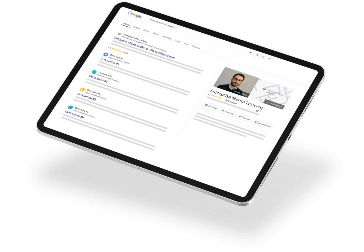 Votre profil ProvenExpert est automatiquement optimisé pour les moteurs de recherche tels que Google afin que les clients potentiels puissent vous trouver facilement par rapport à la concurrence. Obtenez une meilleure visibilité, plus de clics et plus de nouveaux clients grâce aux étoiles de Google figurant dans votre profil ProvenExpert, dans vos annonces Google et sur votre propre site Web.
